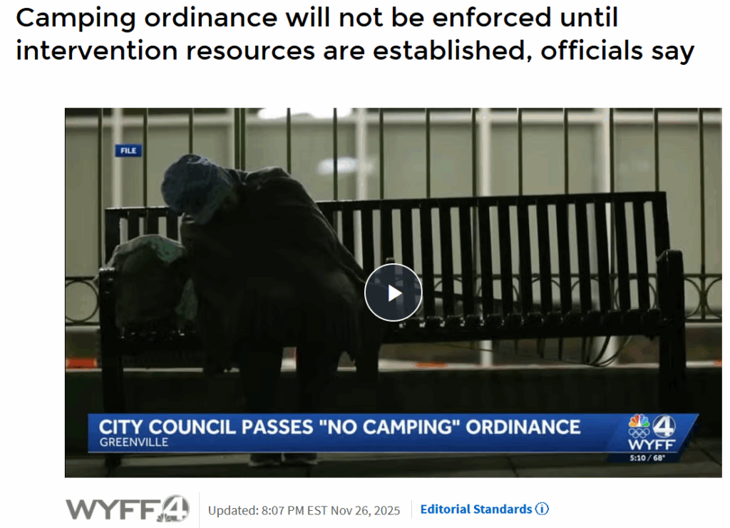 WYFF4 | Camping ordinance will not be enforced until intervention resources are established, officials say