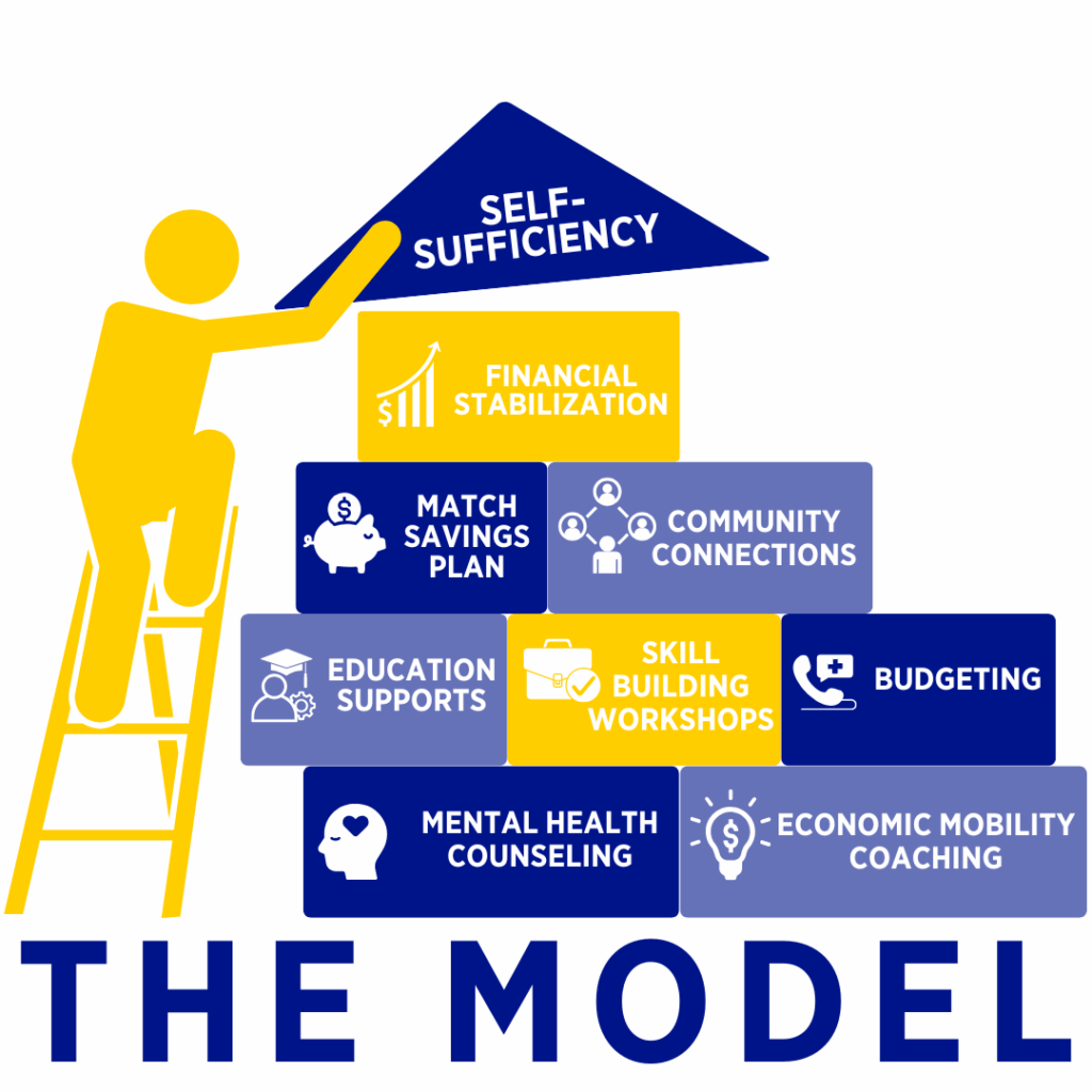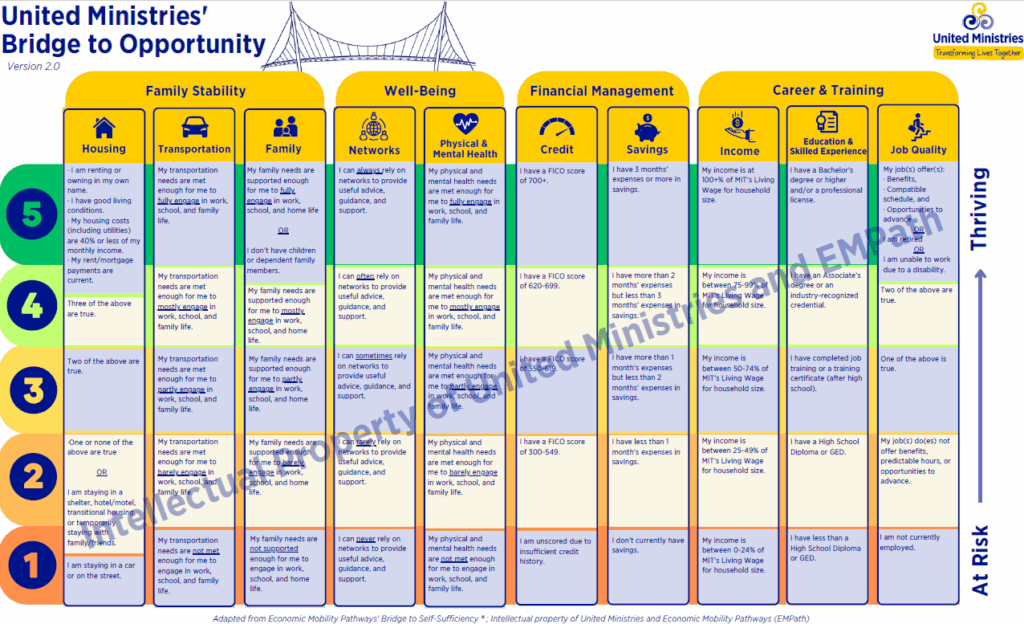 Used alongside Economic Mobility Coaching, The Bridge fosters a strengths-based partnership between mentors and participants, guiding them through a clear, personalized path to self-sufficiency across four key areas: family stability, well-being, financial management, career & training.