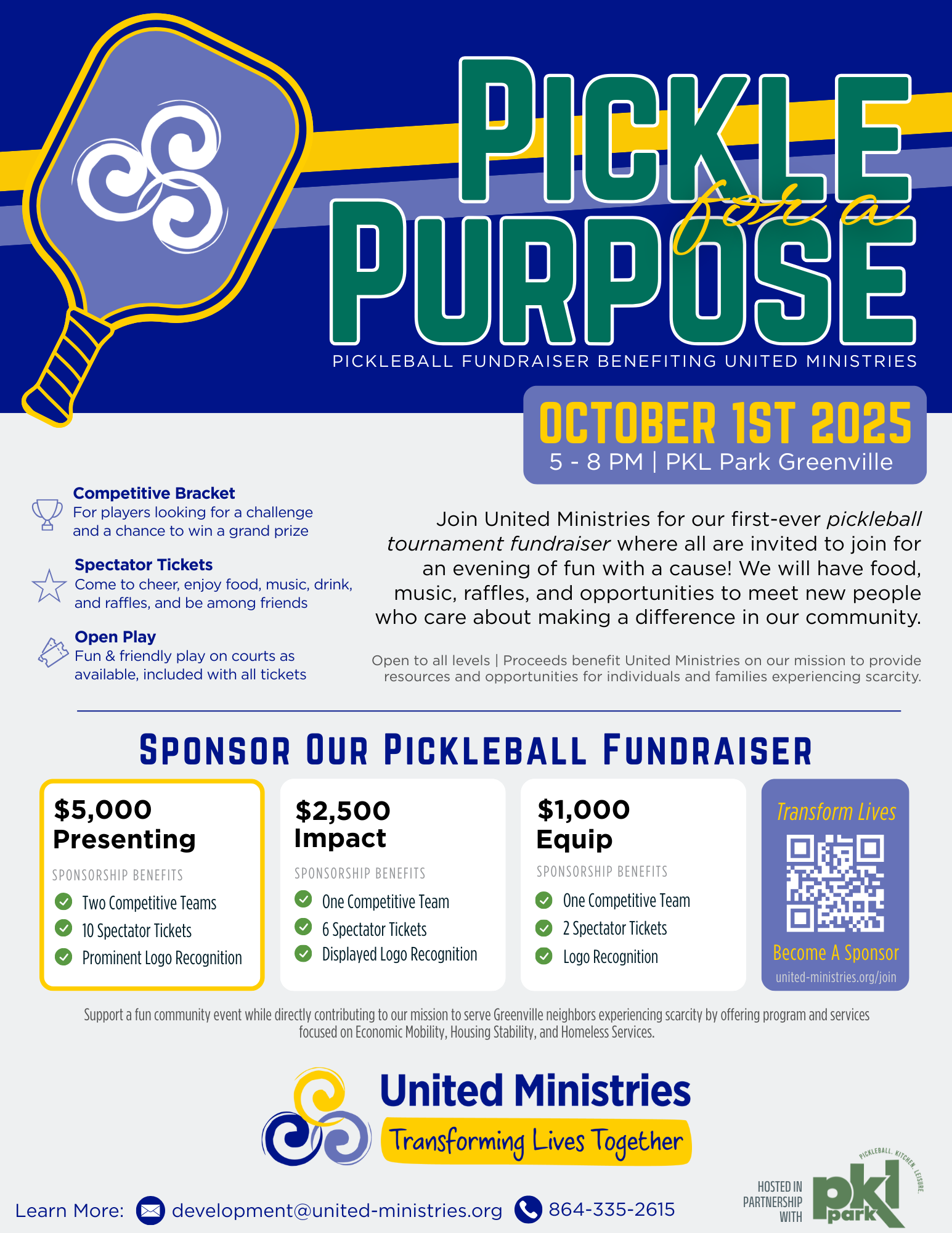 A pickleball fundraiser benefitting United Ministries hosted in partnership with and located at PKL Park Greenville, this event will bring together diverse members of the community for an evening of pickleball, food, raffles, and music.